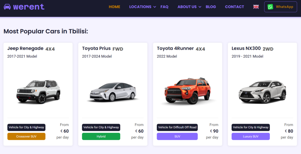 საქართველოს რელიეფის სპეციფიკიდან გამომდინარე, ავტომობილის ტექნიკური მზაობა და გამძლეობა კრიტიკული ფაქტორია. ქვეყნის რეგიონებსა და მაღალმთიან ზონებში უსაფრთხოდ სამოძრაოდ მაღალი გამავლობის ტრანსპორტი კვლავ აუცილებლობას წარმოადგენს. WeRent-ის ფართო ავტოპარკი აერთიანებს 200-ზე მეტ ავტომობილს, საიდანაც 50-ზე მეტი უშუალოდ მძლავრი 4×4 ჯიპია, რომლებიც რთული რელიეფისთვის არის განკუთვნილი. მაღალი ხარისხის უზრუნველსაყოფად, კომპანია იცავს უმკაცრეს ტექნიკურ სტანდარტებს, რაც მოიცავს: